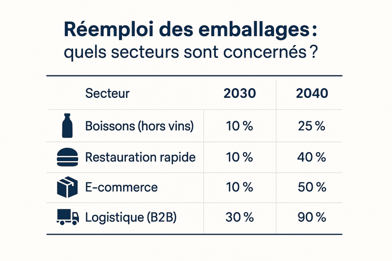 | 2027 | - Début des objectifs de réemploi : • 10 % pour certains emballages de boissons • Objectifs pour la vente à emporter et le e-commerce |